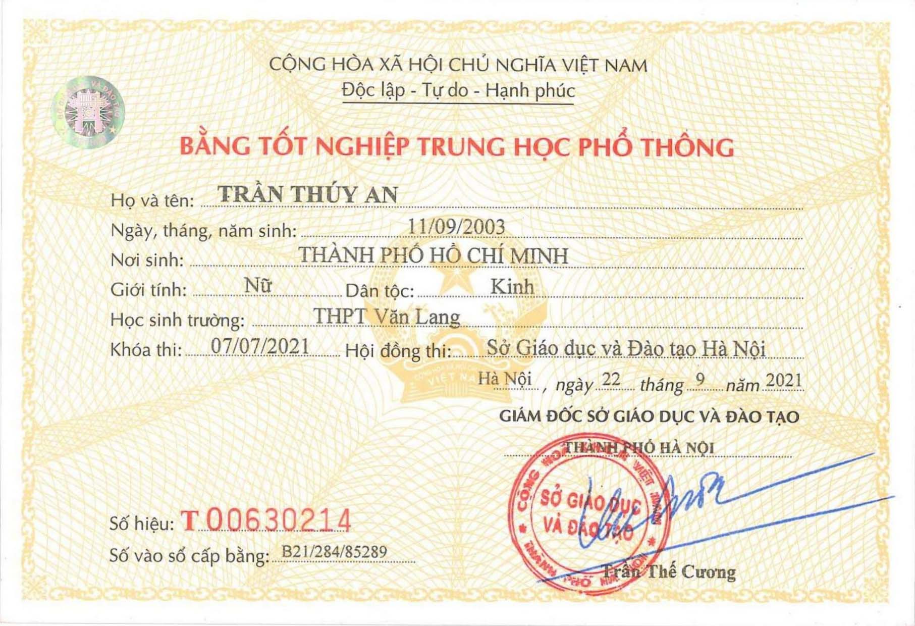 Bằng THPT – Bằng Cấp 3 Ninh Thuận được làm từ phôi thật, tem thật của các trường. Do vậy, chúng tôi đảm bảo chất lượng như bằng thật chất lượng chính xác 100%. Bao soi, bao công chứng trên toàn quốc